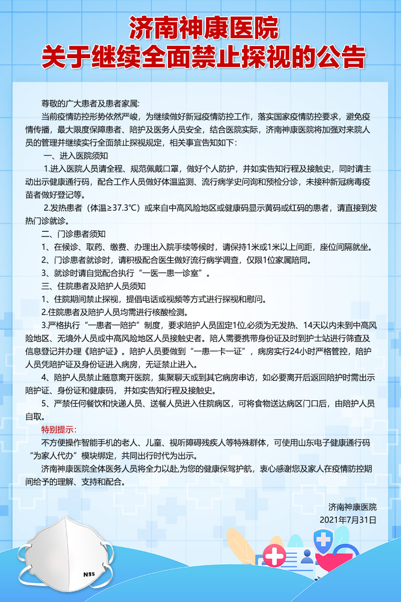 当前疫情防控形势依然严峻,为继续做好新冠疫情防控工作,落实国家疫情防控要求,避免疫情传播,最大限度保障患者、陪护及医务人员安全,结合医院实际,济南神康医院将加强对来院人员的管理并继续实行全面禁止探视规定,相关事宜告知如下: